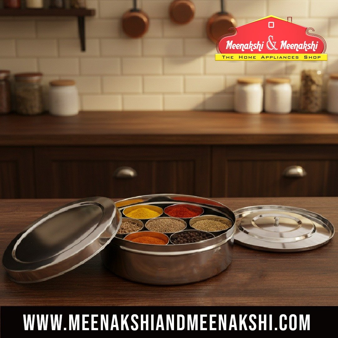 A spice box made of steel, typically containing multiple compartments or containers for storing different spices.