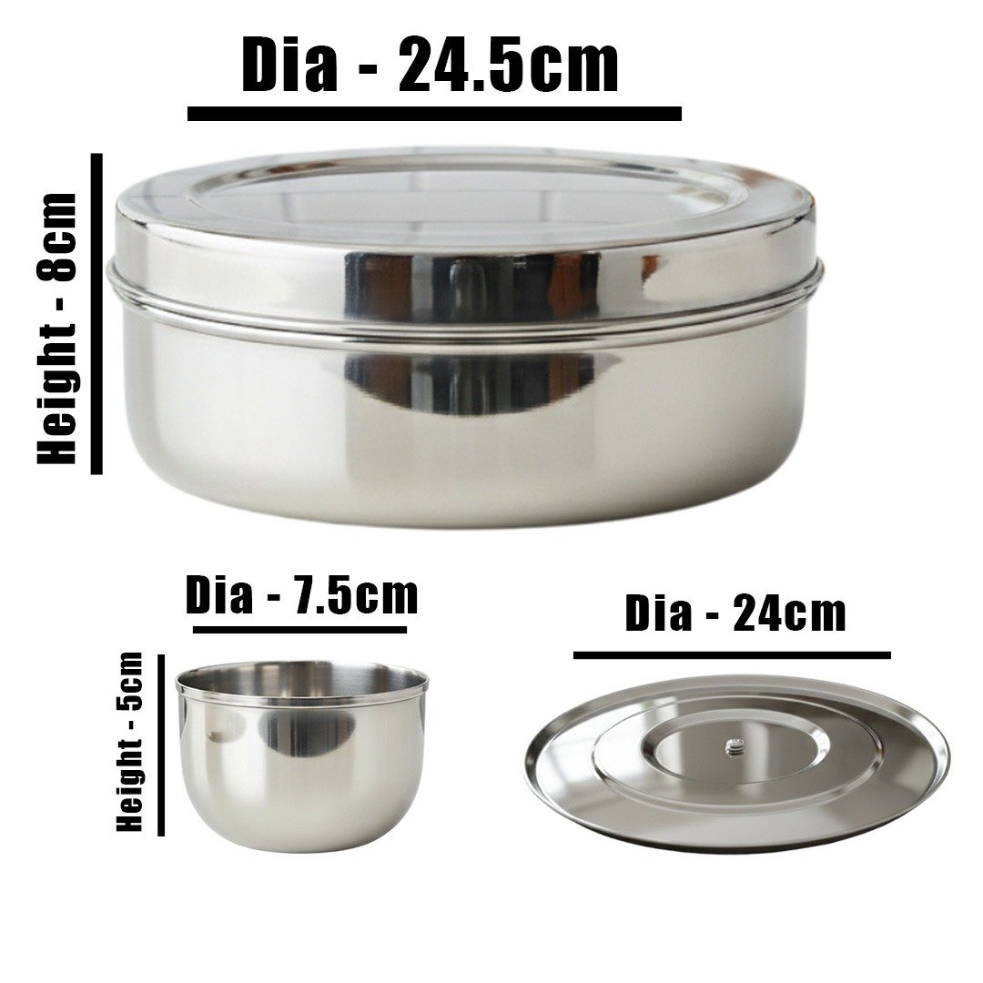 Masala Box : Height - 8cm, Dia - 24.5cm.