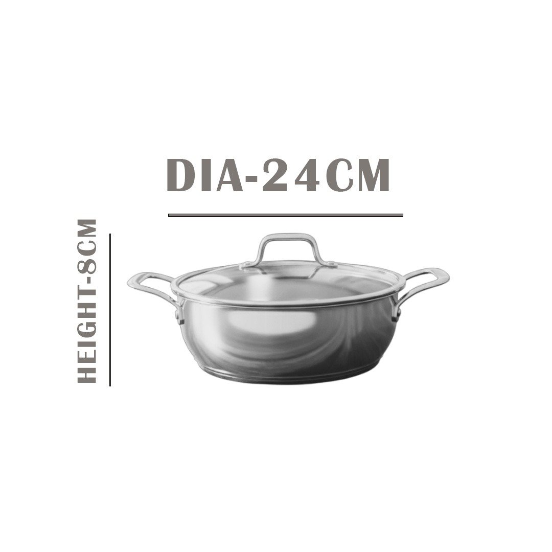 Skillet : Capacity - 3L, Height - 8cm, Dia - 24cm, Weight - 1.480Kg.