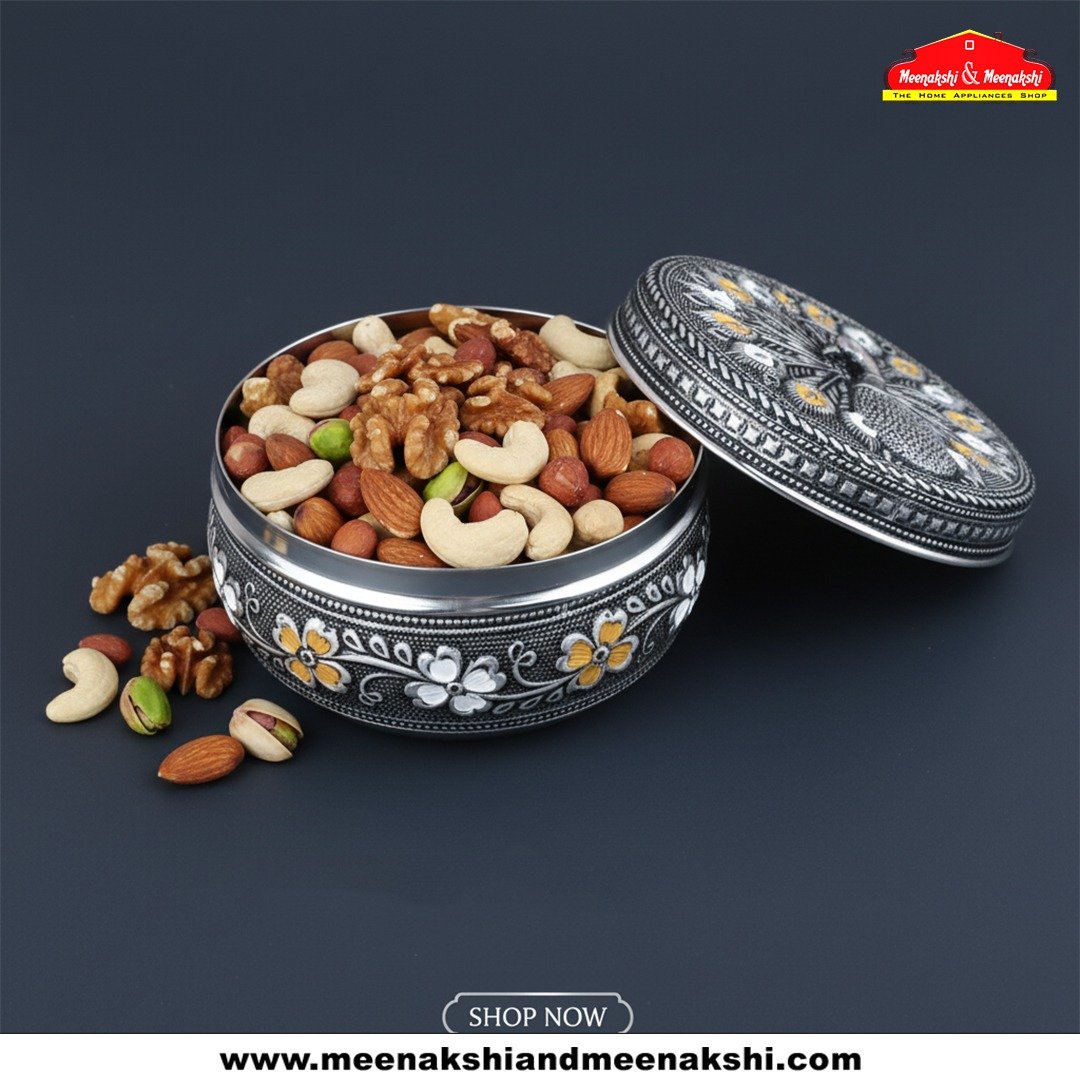 Meenakari steel flat storage container / puri dabba made from the finest stainless-steel material which ensures strength, quality and durability. This flat storage container is rust proof and hygienic.