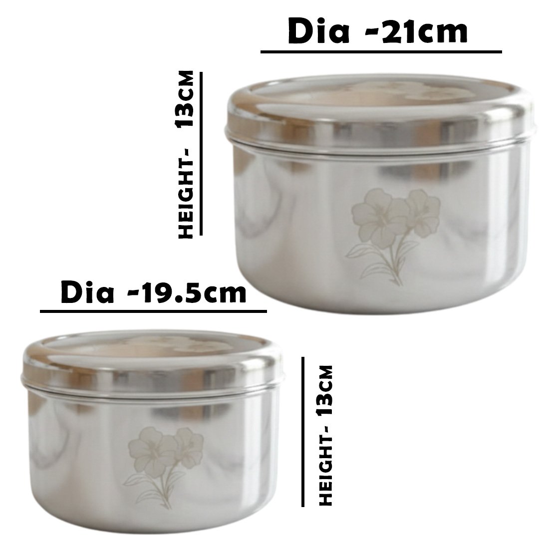 Dabba No-8: Capacity - 3300ml, Height - 13cm, Dia - 21cm.