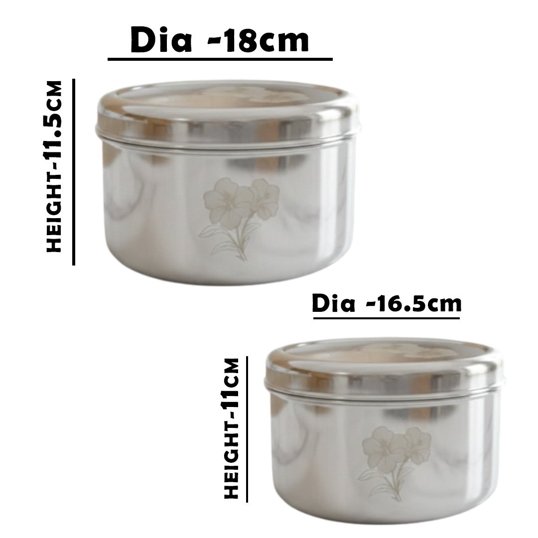 This is a stainless steel food storage canister (dabba) with a laser-etched floral design on the lid.