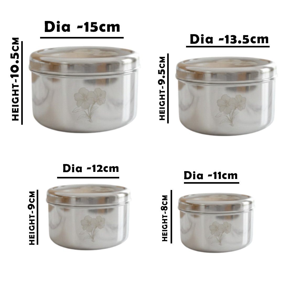 Dabba No-4: Capacity - 1300ml, Height - 10.5cm, Dia - 15cm.