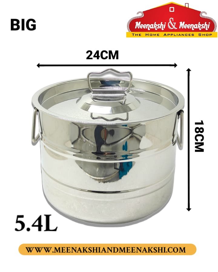 The Stainless Steel Traditional Kopparai is a classic kitchen essential crafted for durability and elegance. With a capacity of 5.4 liters, it is perfect for storing and serving water, milk, or other beverages in traditional Indian households. Made from premium-quality stainless steel, this Kopparai boasts a mirror-like finish that is both rust-resistant and easy to clean. Its traditional rounded design reflects cultural heritage while providing a modern touch, making it suitable for everyday use and special occasions alike. The sturdy, ergonomic handle ensures a firm grip, and the broad base offers stability for easy placement on kitchen countertops or dining tables.