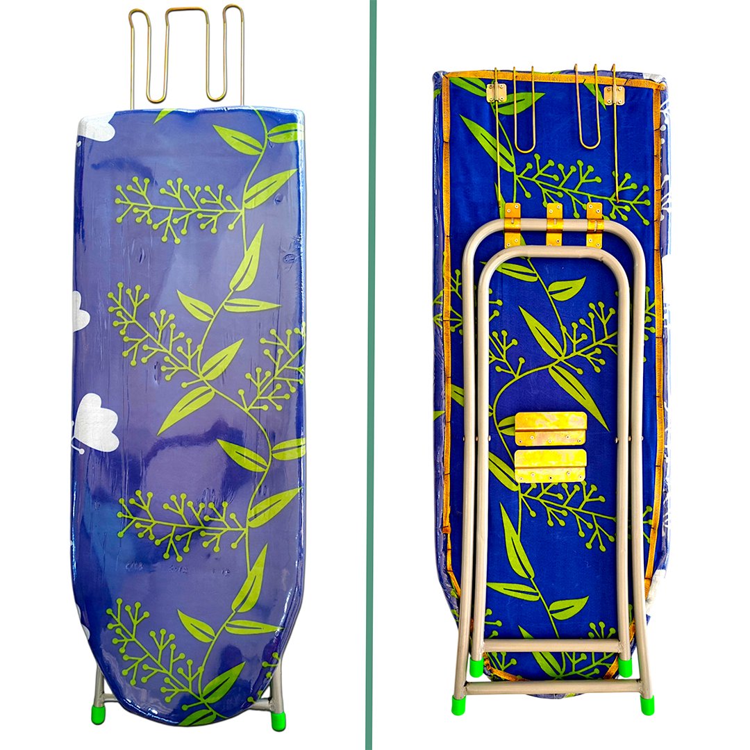 Wide and soft-padded ironing surface with a colorful, printed cover for better fabric grip and heat resistance.