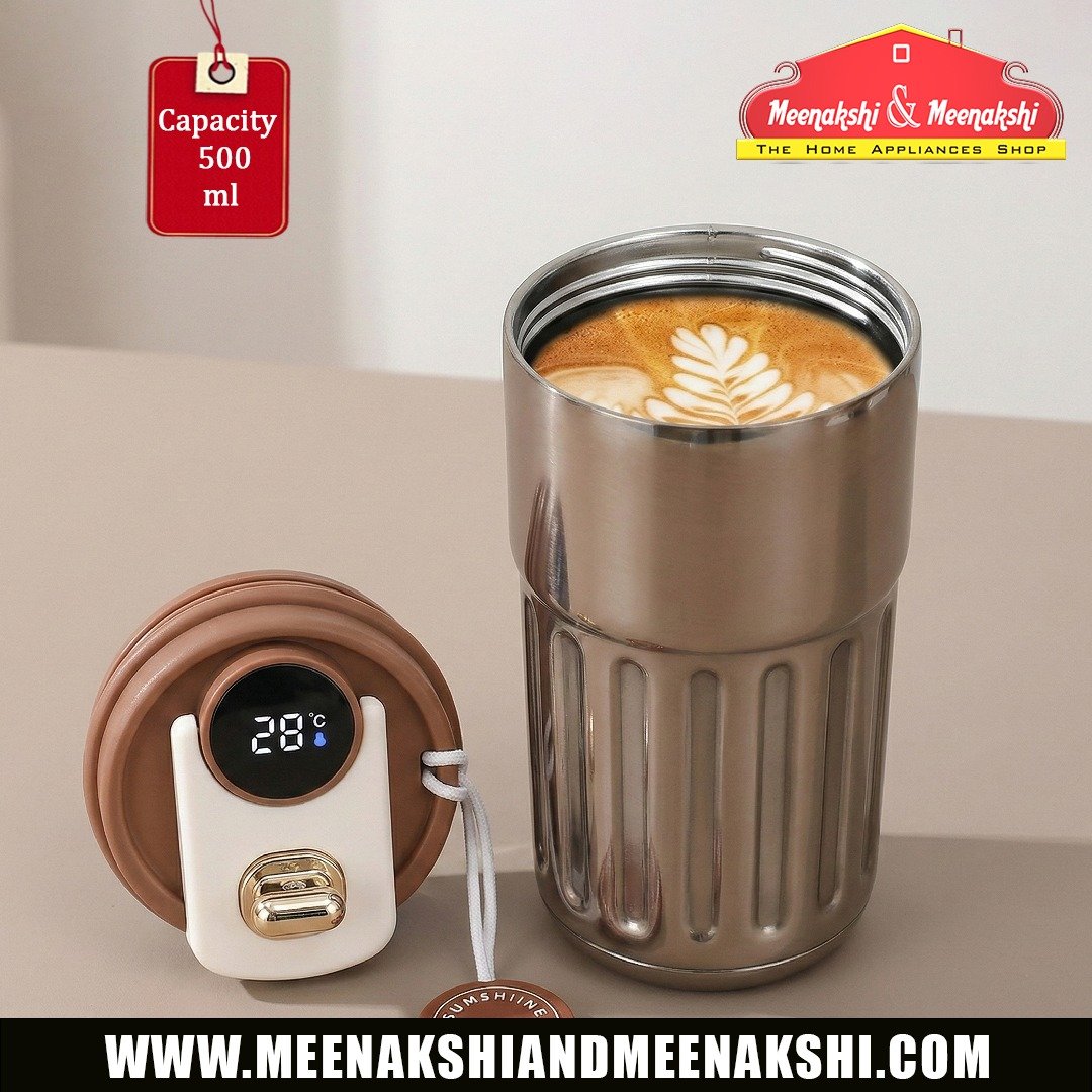 It features a digital screen on the lid that shows the temperature of the beverage inside, allowing users to monitor the drink's warmth.