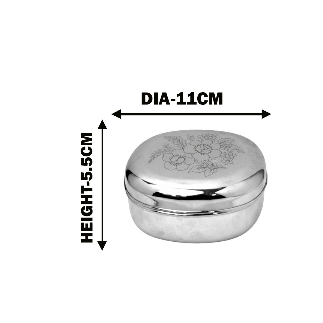 This beautifully polished stainless steel container combines functionality with subtle elegance. The smooth, mirror-like finish and delicate etched floral design on the lid make it both a practical and decorative item. Its sturdy build ensures long-lasting use while maintaining a refined appearance.