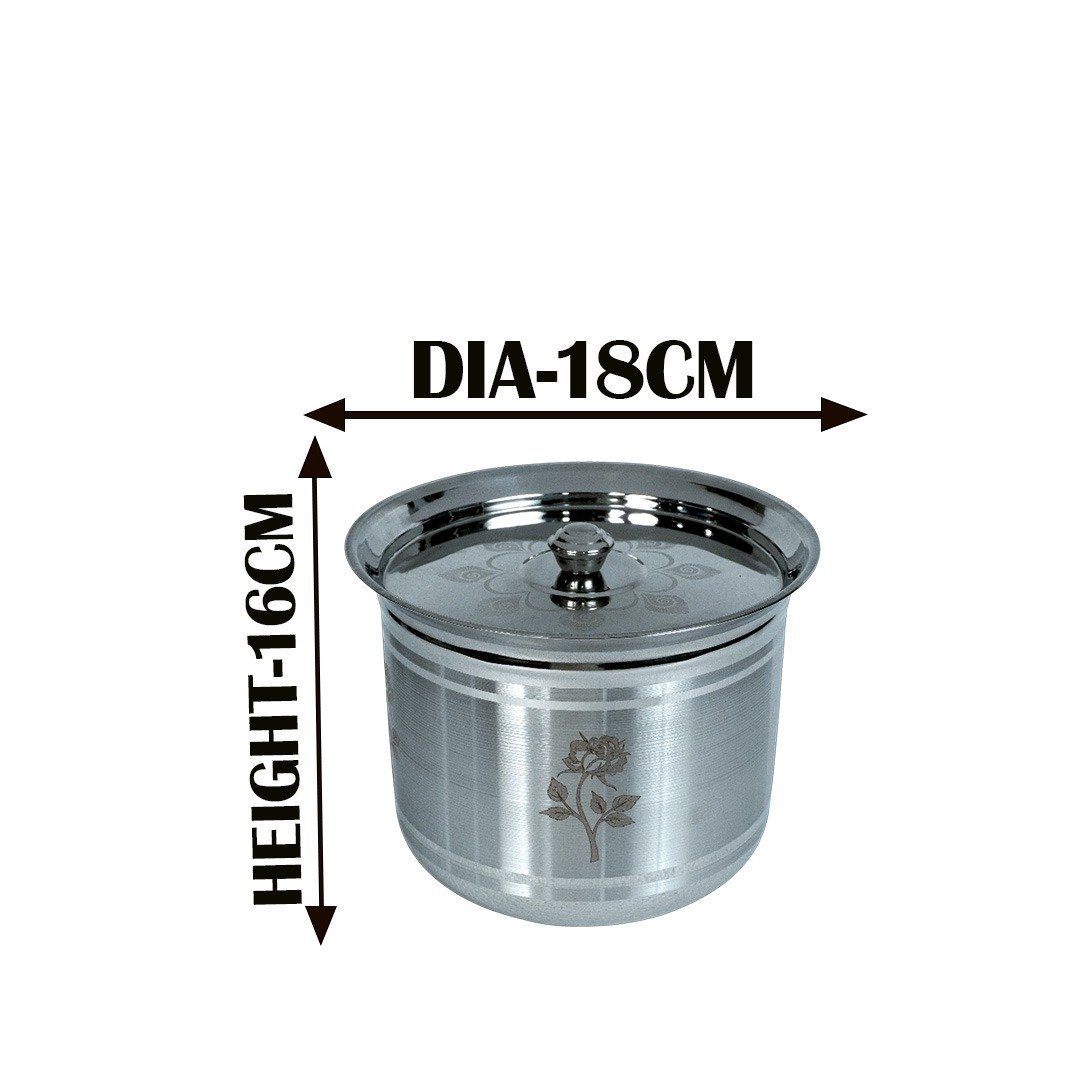 Enhance your kitchen collection with this Elegant Stainless Steel Container with Lid, designed for both storage and serving. Crafted from premium food-grade stainless steel, it ensures durability, hygiene, and long-lasting shine. The engraved floral design adds a traditional and stylish touch, making it perfect for everyday use or gifting.