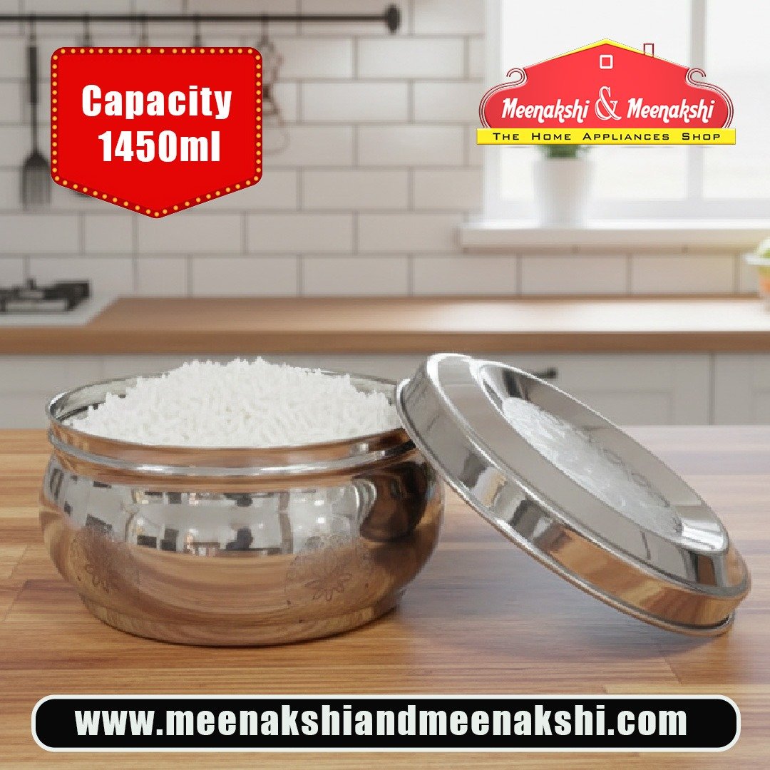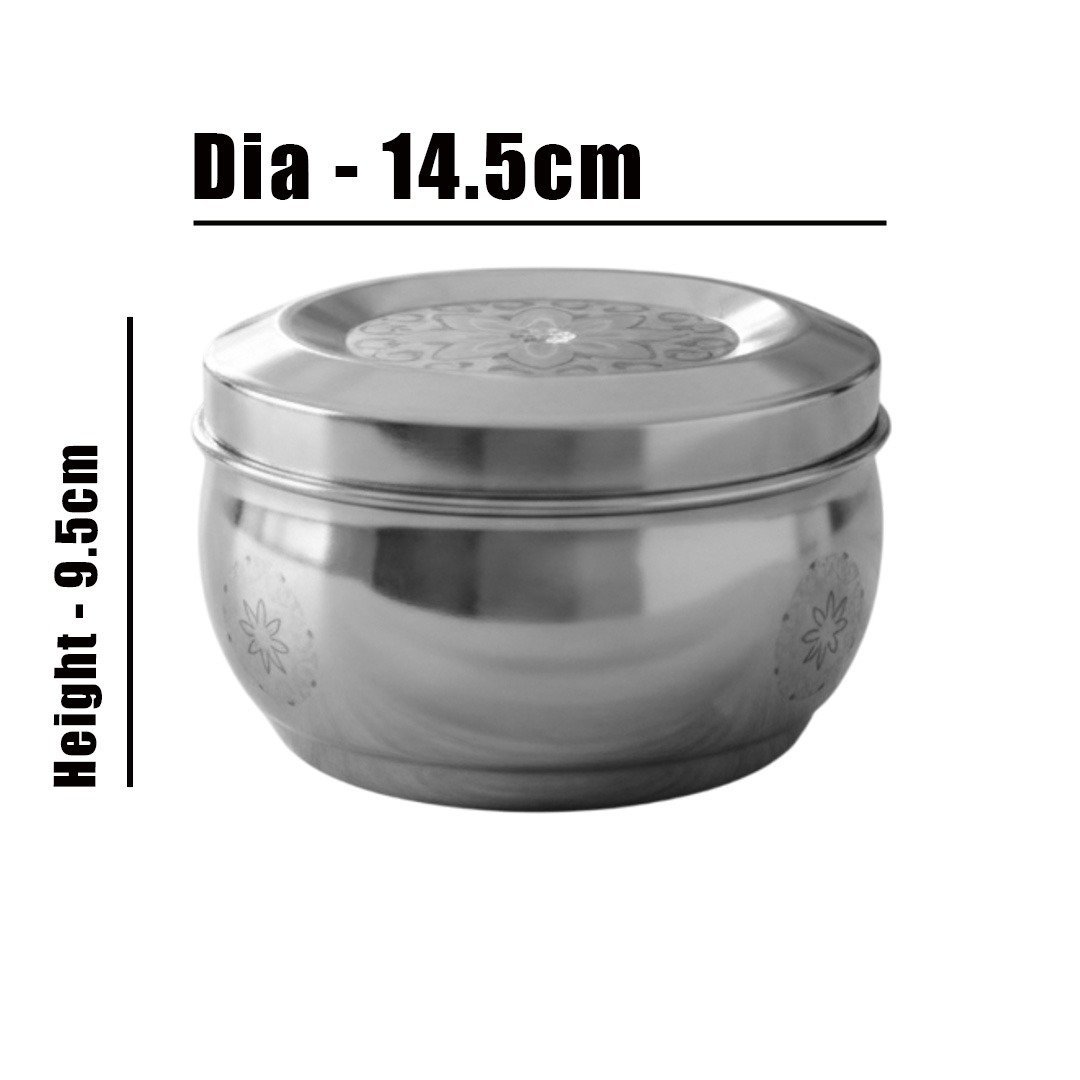 Dabba : Capacity - 1450ml, Height - 9.5cm, Dia - 14.5cm, Weight - 340g.