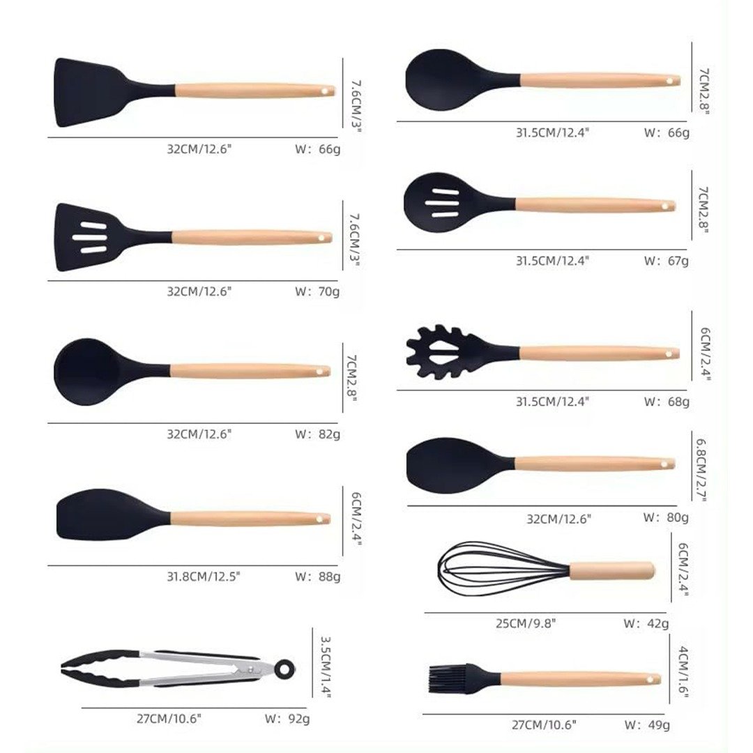 The 12 professional silicone kitchen utensil set includes solid turner, slotted turner, pasta server, deep soup ladle, slotted spoon, solid spoon, egg whisk, basting brush, spatula, spatula spoon, tong, utensil holder. They are kitchen essentials to meet your daily different kitchen