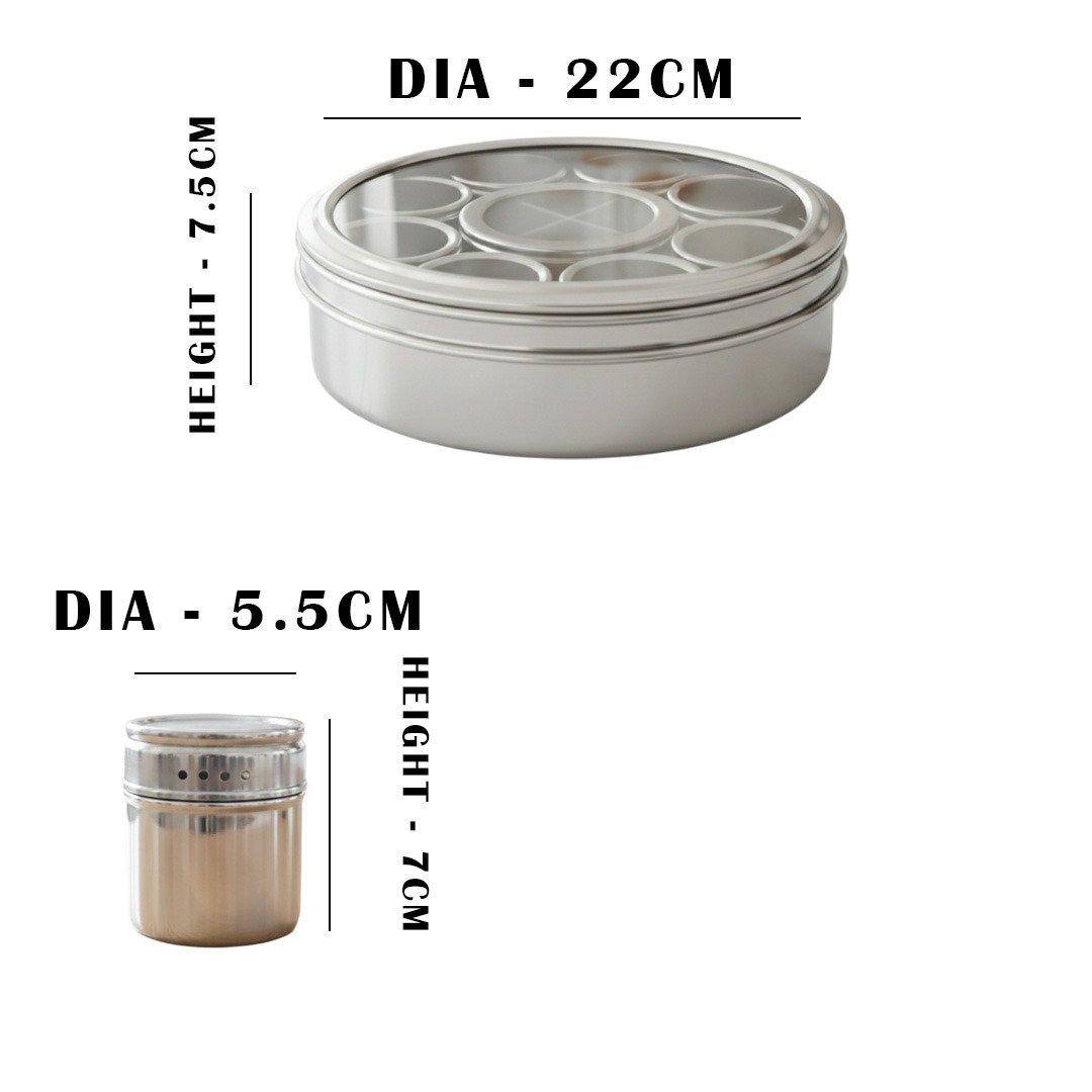 The stylish masala organiser for kitchen has NINE 9 inner Containers with individual lids on it and small size Spoon.