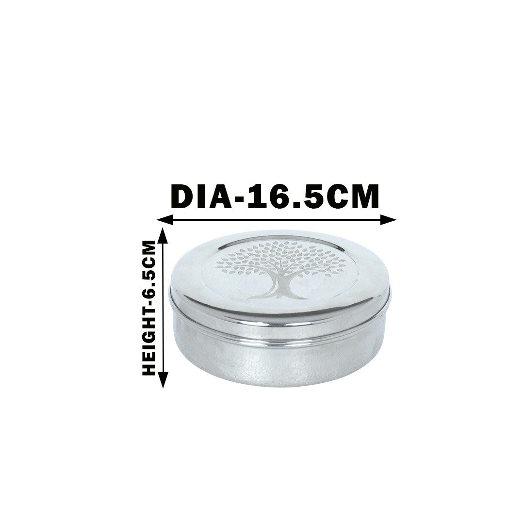 This premium stainless steel container features a beautifully engraved Tree of Life design on the lid, symbolizing strength and growth. It combines functionality with style, making it suitable for storing food items or as a decorative storage box.