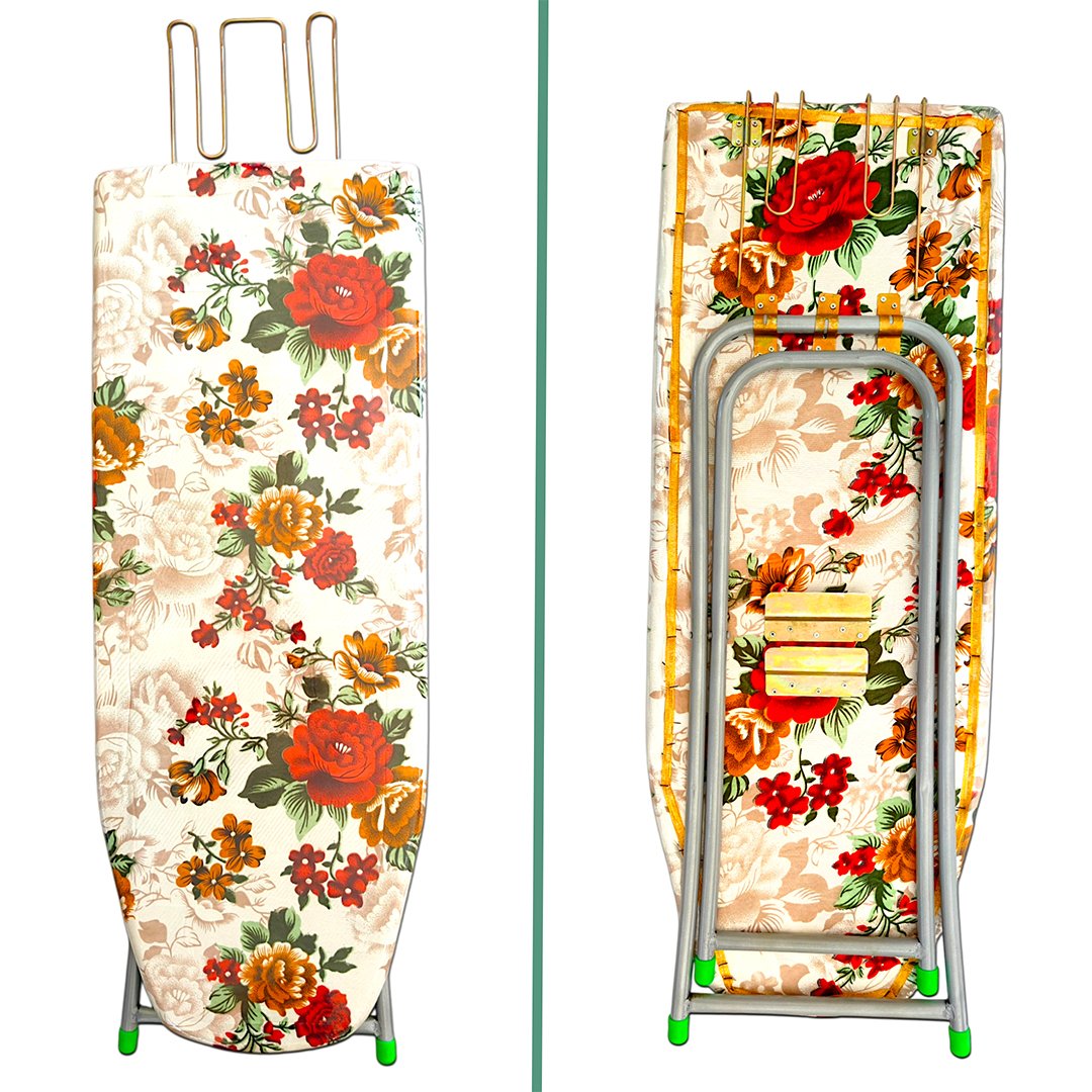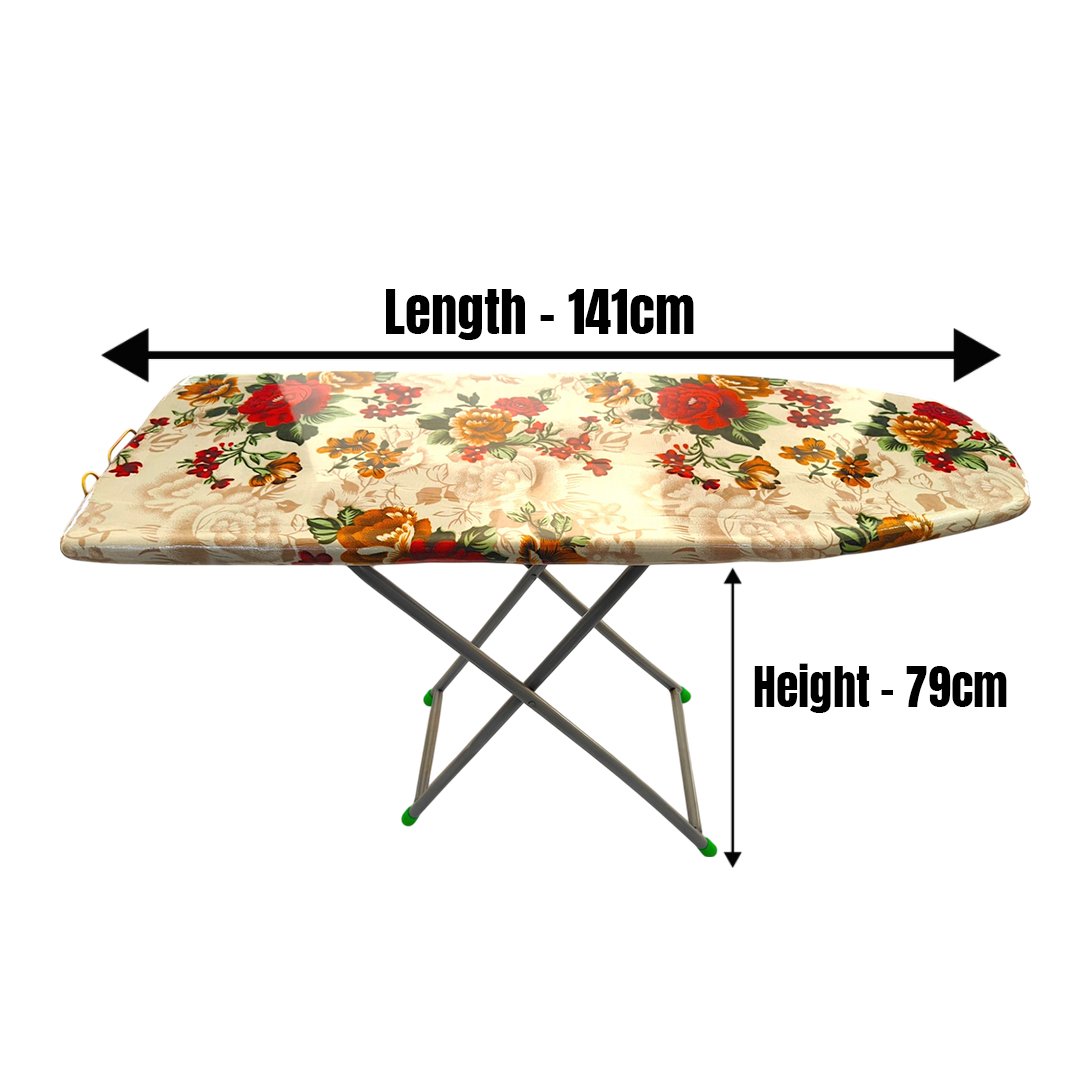 Wide and soft-padded ironing surface with a colorful, printed cover for better fabric grip and heat resistance.