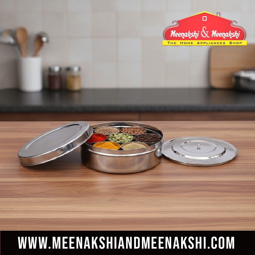 A spice box made of steel, typically containing multiple compartments or containers for storing different spices.