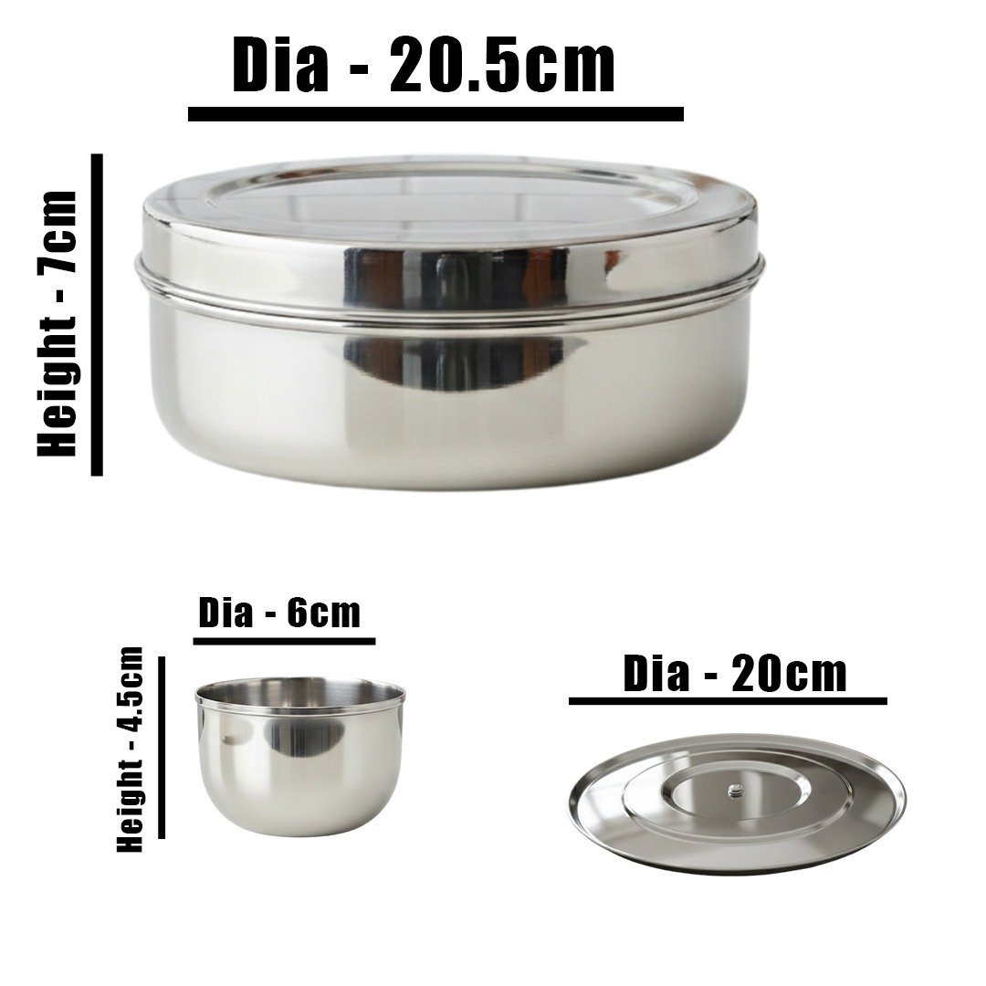 Masala Box : Height - 7cm, Dia - 20.5cm.