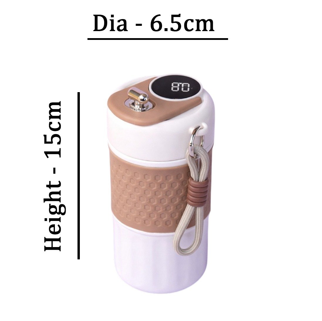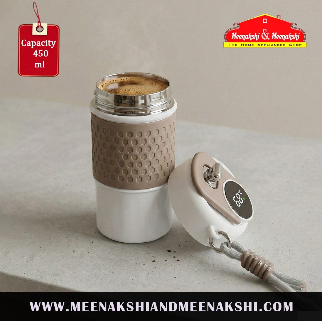 It features a digital screen on the lid that shows the temperature of the beverage inside, allowing users to monitor the drink's warmth.