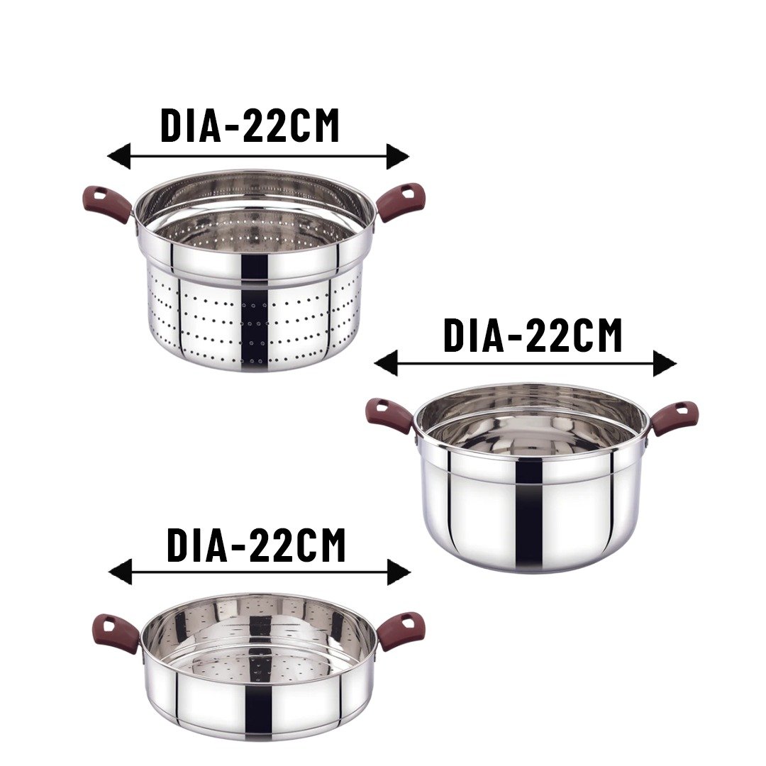 Designed for versatility and convenience, this Multi Cooking Pot comes with idly plates, a strainer, a steamer plate, and a cook-and-serve pot—all in one compact unit.