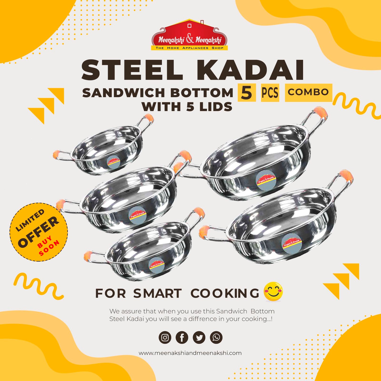 MM SS 5 Pcs Sandwich Bottom Steel Kadai with 5 Pcs Lid