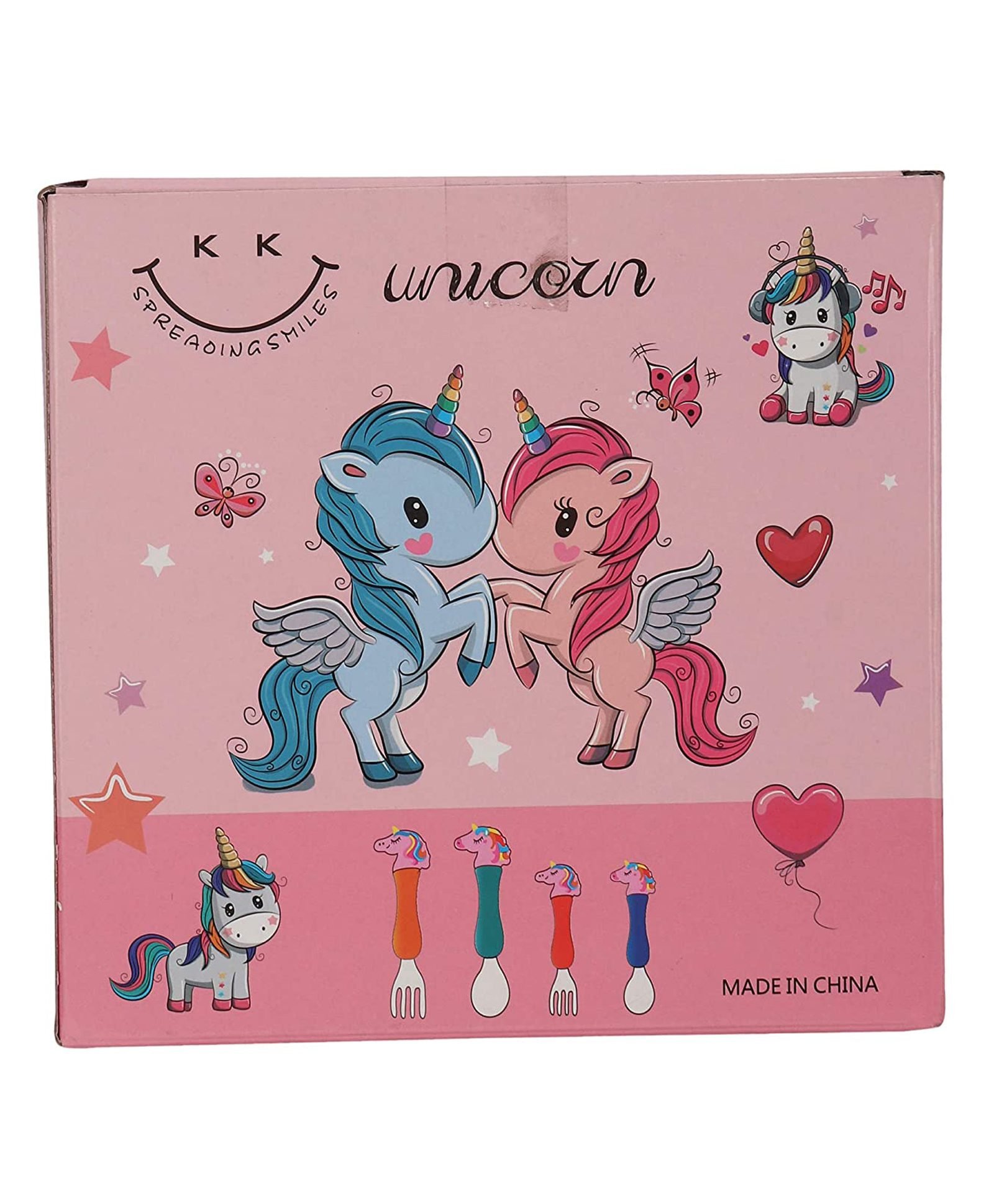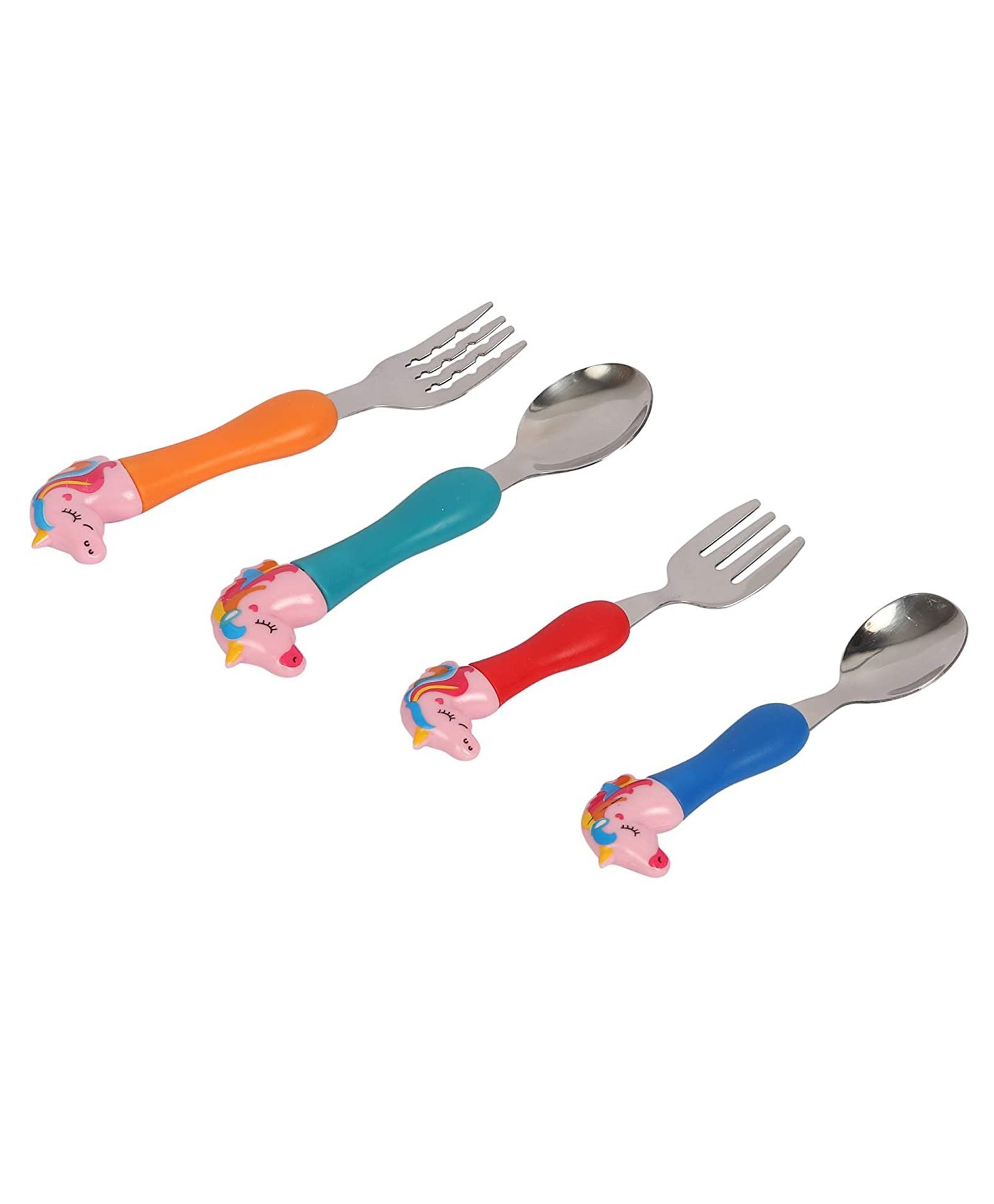 - The set includes 2 spoons and 2 forks. Made from stainless steel, this set is sized just right for little hands to grasp and use. The colorful set with cute design is a must have tableware for kids.