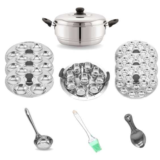 Package Content: 1-Piece Stainless steel kadai,1- Piece lid, 3- Piece Idli plates, 3- Piece Baby Idli plates, 9-Piece Cup Idli and 2Ladle with Silicon Brush