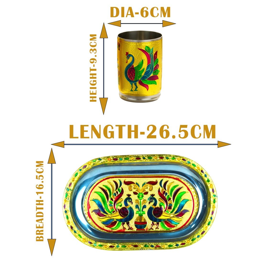 The image displays a Meenakari serving tray set, which includes an oval-shaped tray and two glasses, all featuring intricate peacock designs with vibrant enamel work.
