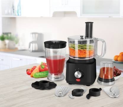 • Includes 1. Multi-Utility Jar - 2 Ltr - 1 Unit 2. Blender Jar - 1.8 Ltr - 1 Unit 3. Grinder Jar - 0.4 Ltr - 1 Unit 4. Kneading Blade - 1 Unit 5. Chopping Blade - 1 Unit 6. Slicing Blade - 1 Unit 7. Shredding / Grating Blade - 1 Unit 8. Whisking / Emulsifying Blade - 1 Unit