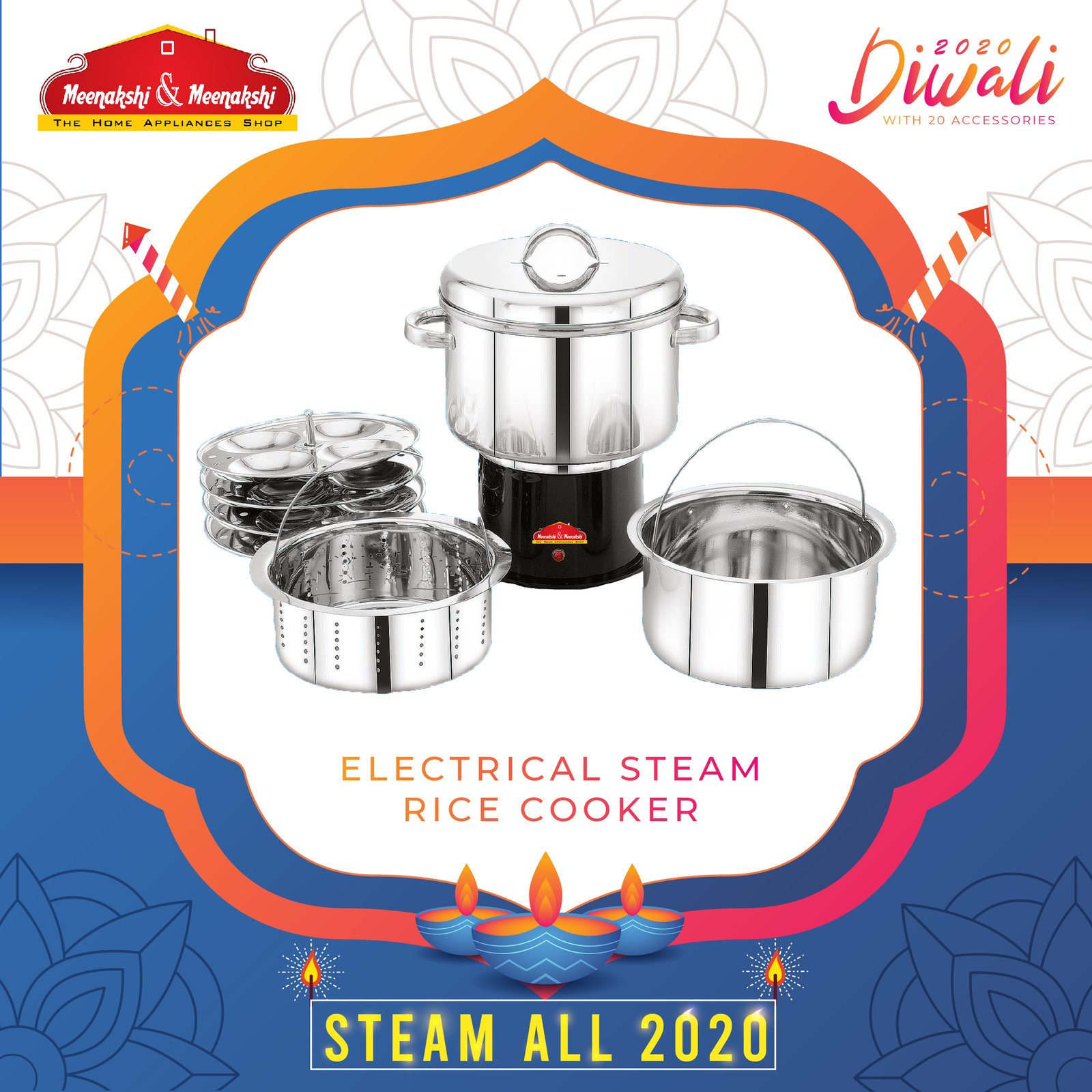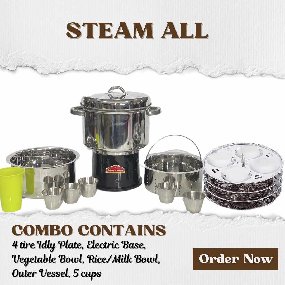 - Includes 4 tire Idly Plates, Electric Base, Vegetable Bowl, Rice/Milk Bowl, Outer Vessel, 5 cups