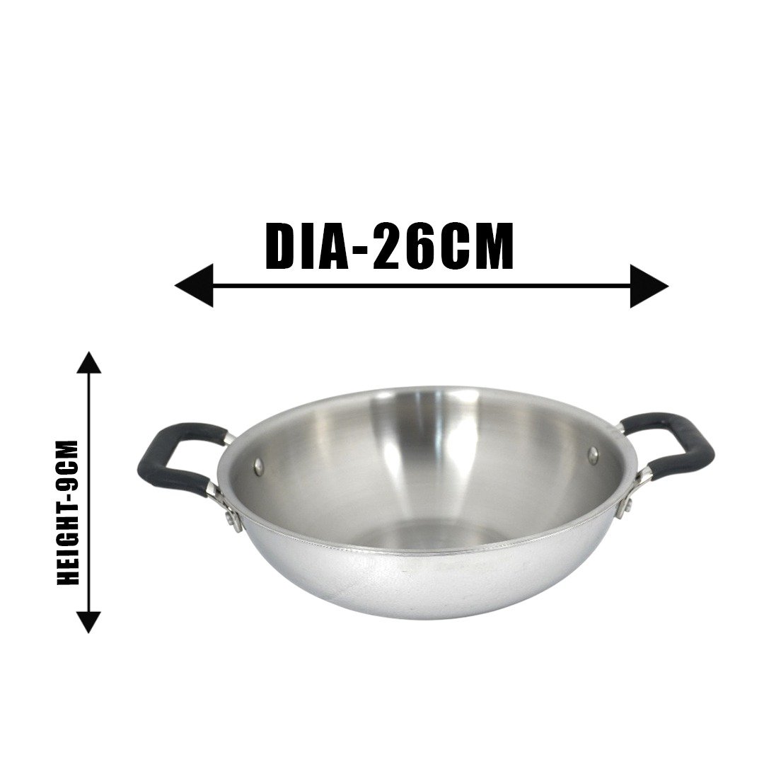 It is a stainless steel kadai with a triply construction, featuring an aluminium core between layers of stainless steel for even heat distribution.