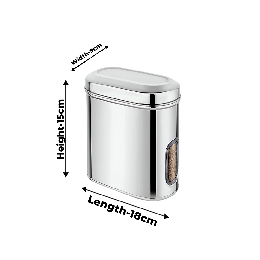 This product is a stainless steel Capsule Seethrough Container, commonly used in kitchens for storing dry food items such as pulses, snacks, cereals, or spices