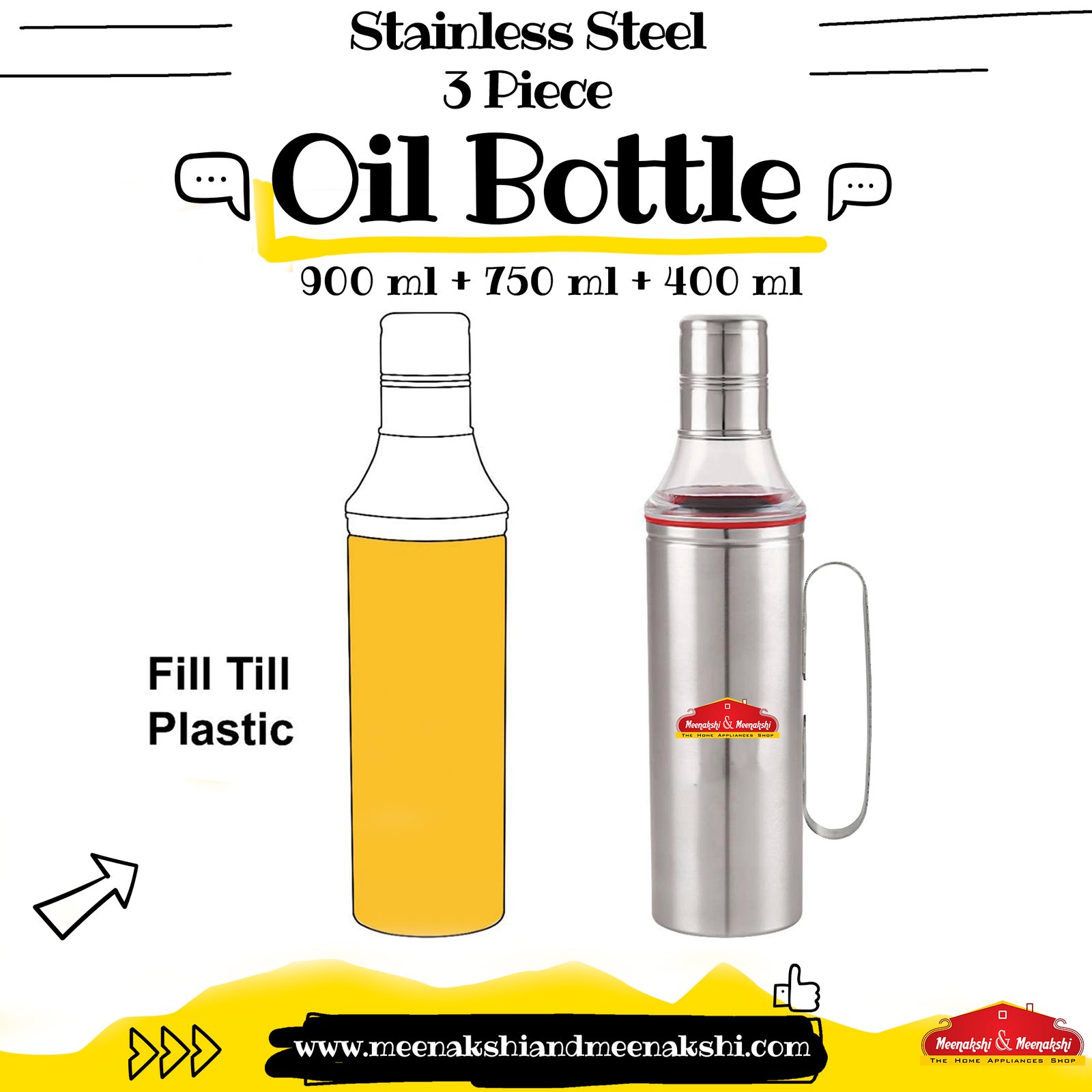Package Contents: 1 Stainless Oil Pot with handle (750 ml +400 ml + 900ml )