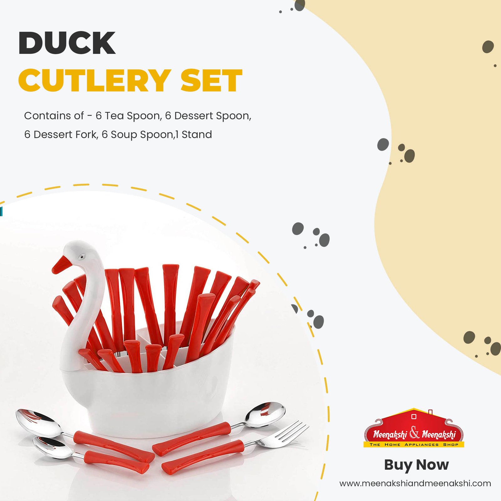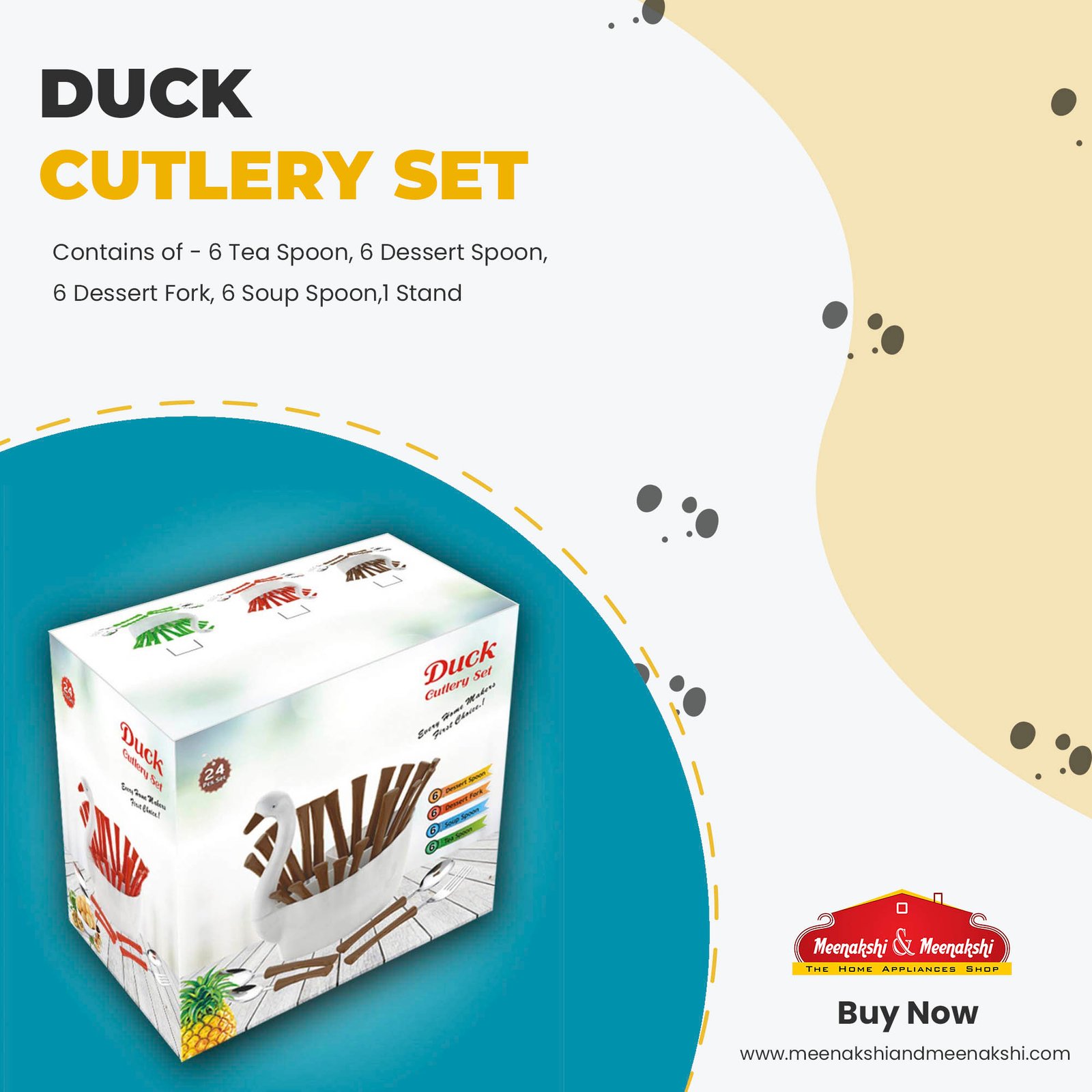 - This attractive set of 25 pcs Duck Style Cutlery set 6 Tea Spoon, 6 Dessert Spoon, 6 Dessert Fork, 6 Soup Spoon,1 Stand Steel Cutlery Set with 1 Stand