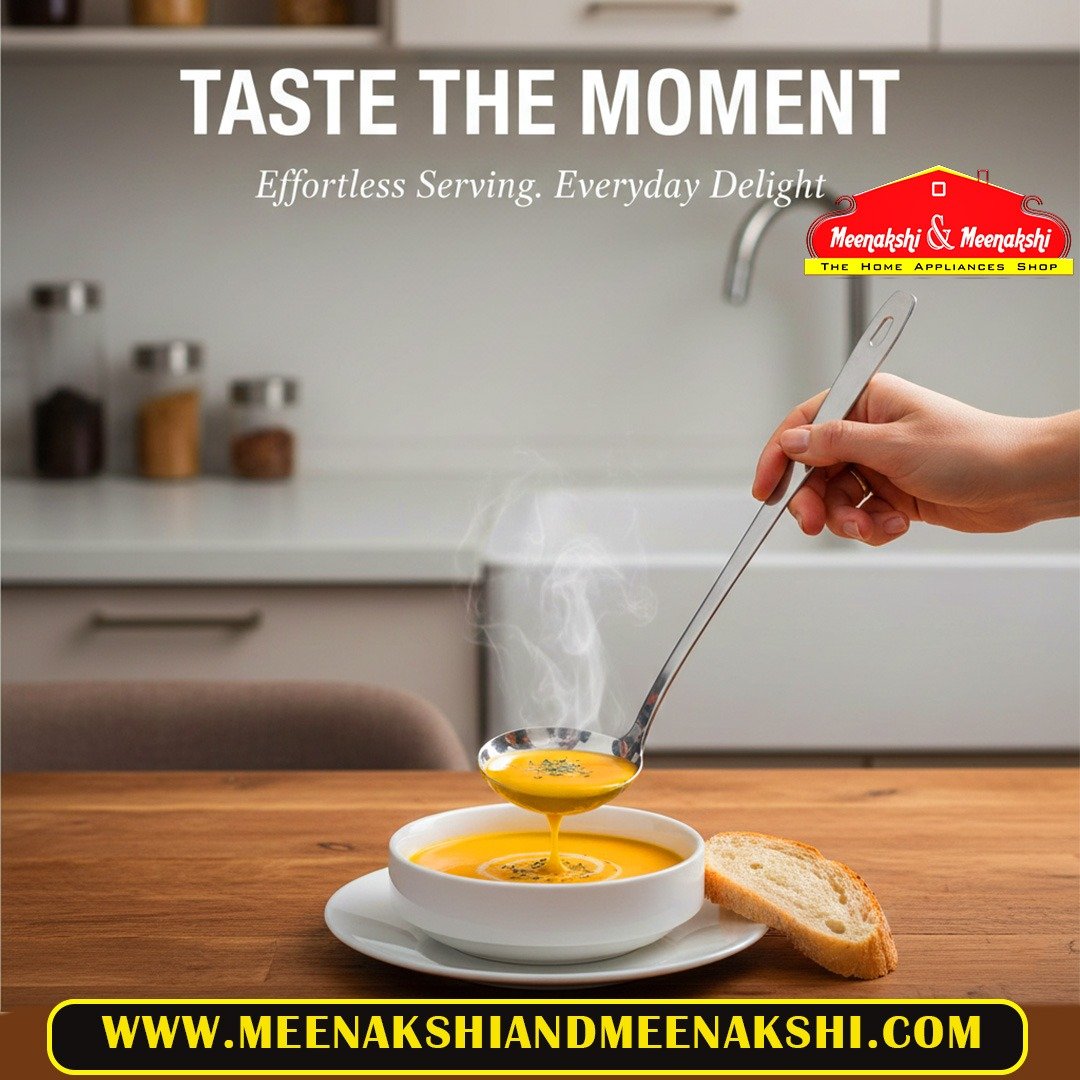 This is a premium stainless steel long-handle serving spoon, perfect for daily cooking and serving needs. The deep round bowl is designed for easy scooping, stirring, and serving gravies, curries, soups, and other liquid dishes.