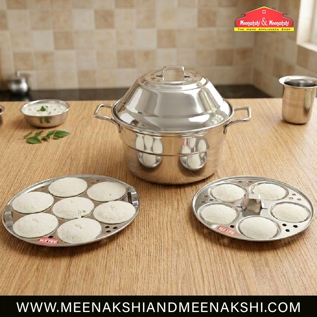 Typically includes multiple plates for making regular idlys, mini idlys, and a flat plate for steaming vegetables, dhokla, or momos.