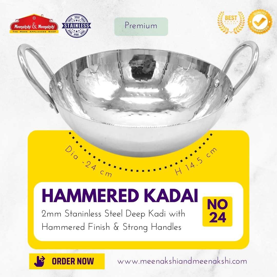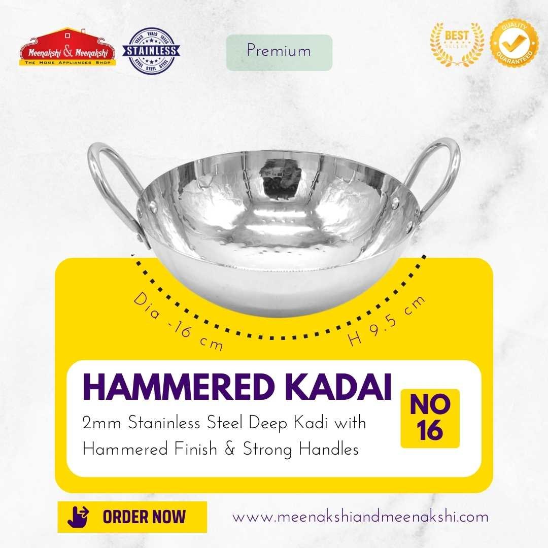 The 2mm Traditional Hammered Kadai has a heavy base and is made up of high-quality stainless steel which makes cooking easy and efficient.
