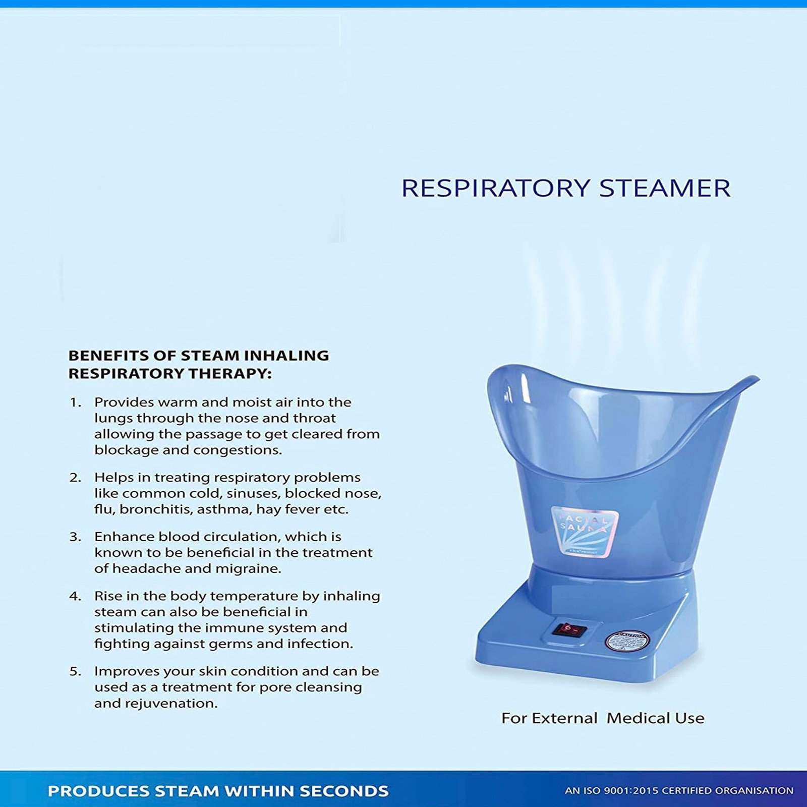 Do not use RO water as it stops the steam generation process. The Steamer is designed in a unique way, made up of a plastic body, which is shock-free and light. The attachments are provided with a smooth edge for nasal and facial purposes.