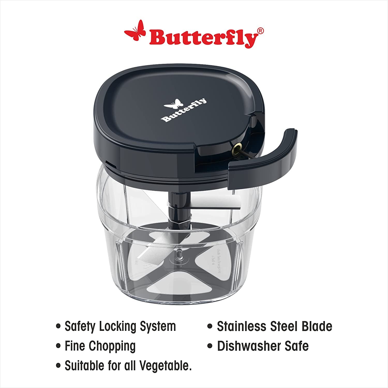 Butterfly Presents a Premium Vegetable Chopper it chops All Types of Vegetables and Fruits with Ease. It is is suitable to cut and chop your vegetables, dry fruits, nuts, etc. into tiny pieces with just few pulls of the chord. Make salad, gravy, paste, etc. more easily and quickly.