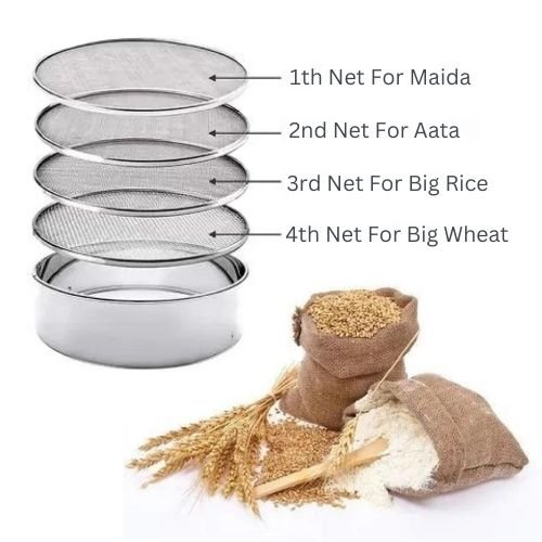 This sieve set is very useful for wheat flour,rice ,maida , porridge,all pulses and for other thing. This sieve contain 4 types of jaalis for every sieving kitchen need.