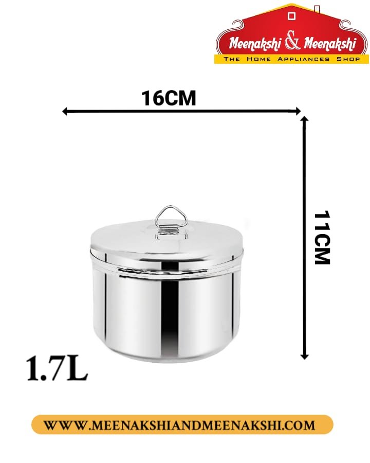 The Stainless Steel Traditional Dabba with a capacity of 1.7 liters is a durable and versatile storage container designed to preserve the freshness of dry goods like grains, pulses, spices, or snacks. Made from high-quality stainless steel, this dabba is rust-resistant, hygienic, and built to last for years. Its sleek, polished finish adds a touch of elegance to any kitchen, while the sturdy, airtight lid ensures the contents remain secure and free from moisture or pests.