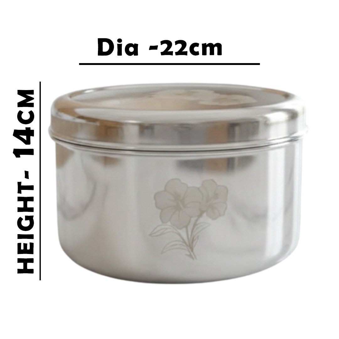 This is a stainless steel food storage canister (dabba) with a laser-etched floral design on the lid.