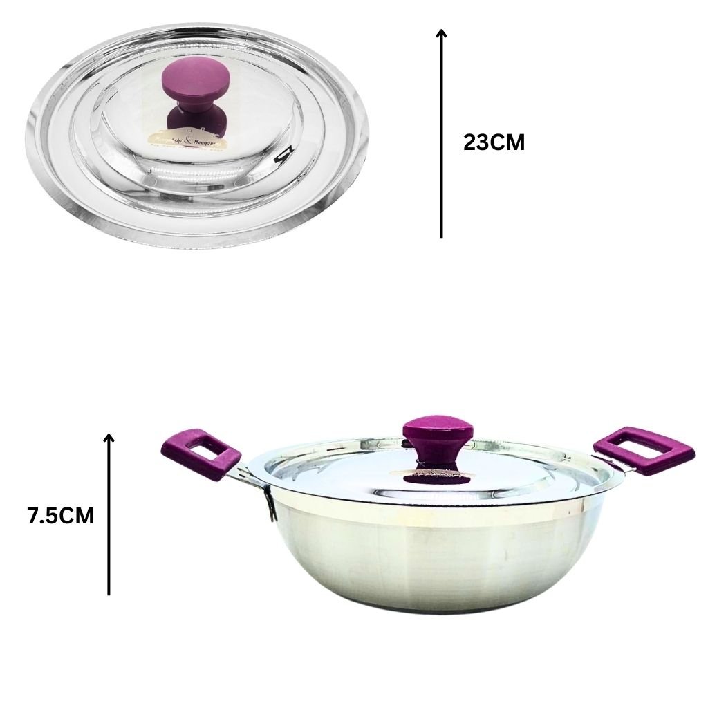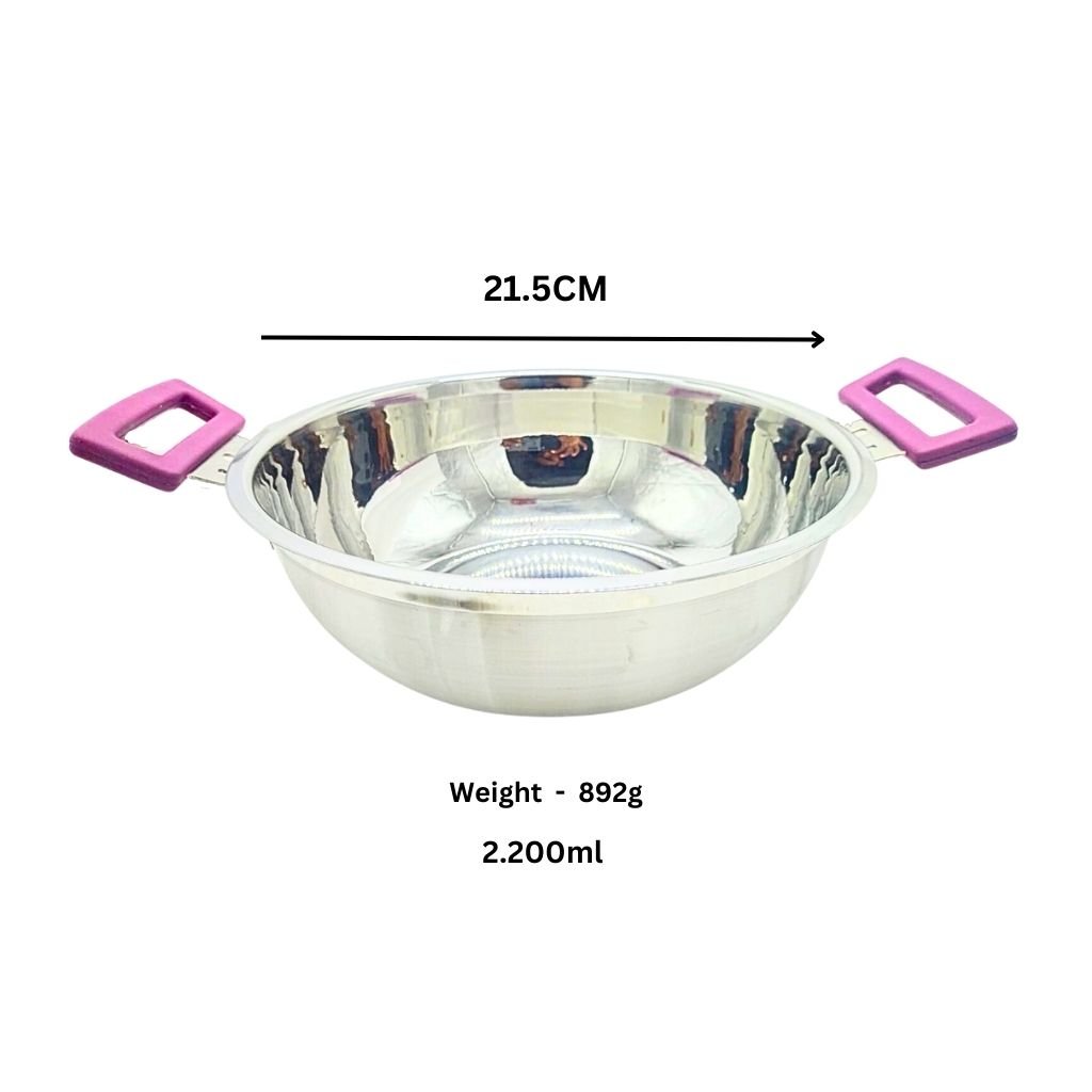 elegant, sturdy, carefully designed for handling comfort and safety. Suitable for, Deep-frying Puri, Samosa, Wada, French Fries, Pakora Stews, Curries and Korma, Upma, Poha Cooking vegetables, paneer, seafood, fish, chicken, meat Halwa, Rabri, Phirni, Semiya, Kheer