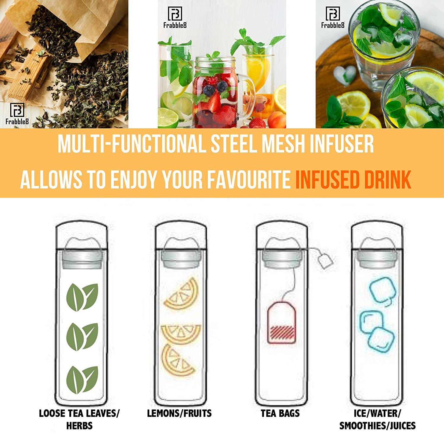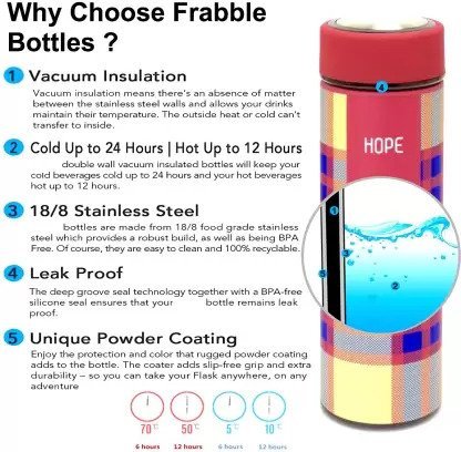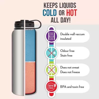 ? SUPERIOR INSULATION THERMOFLASK : Double walled vacuum sealed construction made from copper coating helps the bottle to retain the heat. Sports screw lid cap with Mesh Tea Fruits Infuser or Strainer for detox and helps to maintain the temperature up to 8 hrs to 12hrs