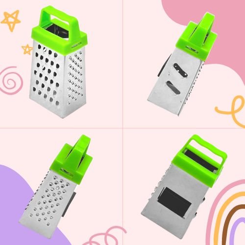 • The grater for ginger garlic has four functional sides with unique shredding patterns, a perfect tool for multitasking in the kitchen. This small box cheese grater is made of stainless steel with plastic handle. The tiny ginger grater is four-sided mini grater: slice, fine, medium, coarse.