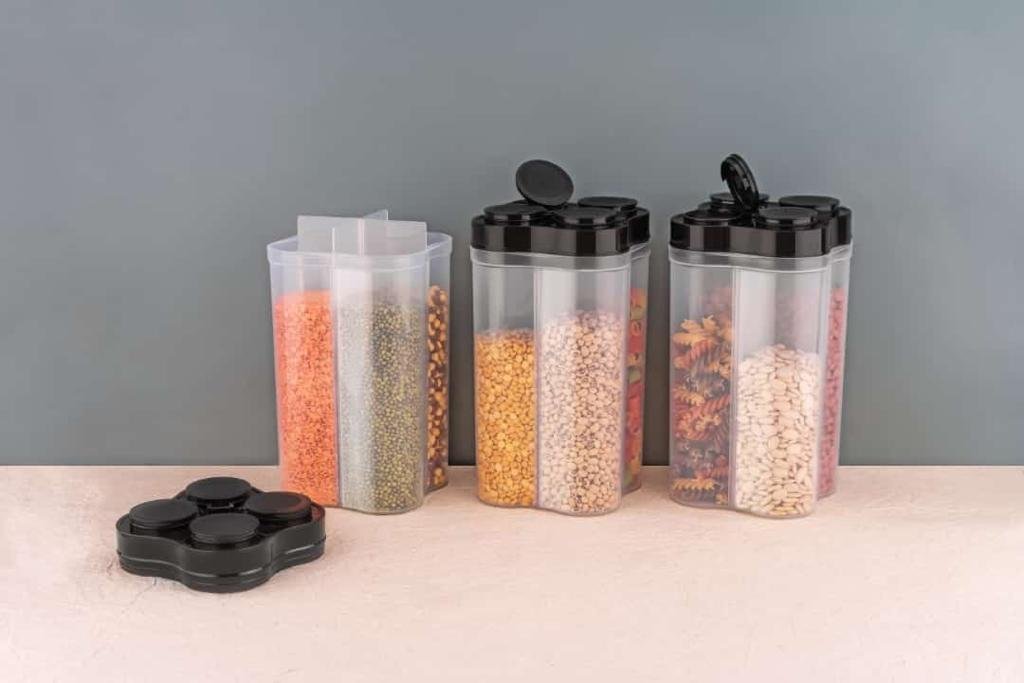 The containers are stacked for compact storage, and the thick and durable container walls are suitable for daily use