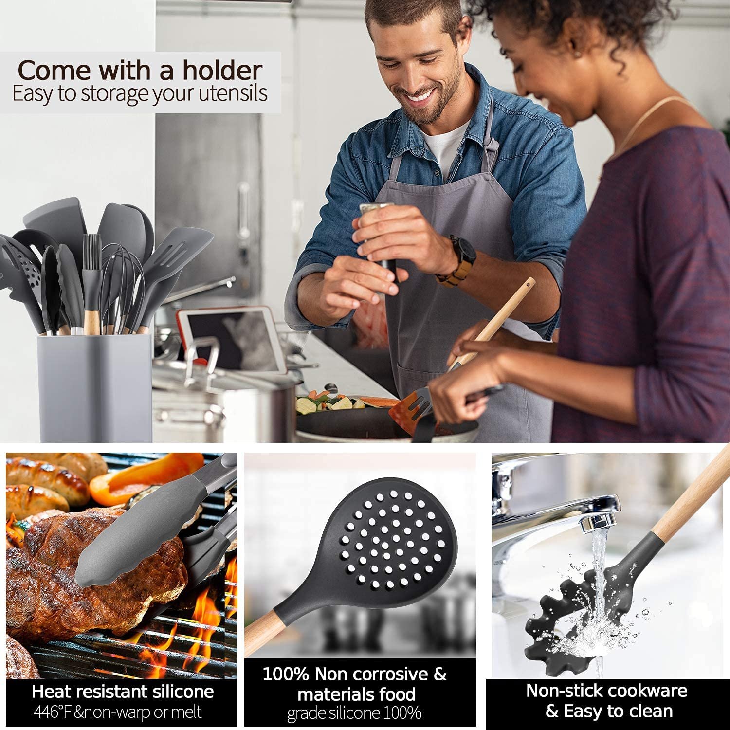 Our flexible silicone heads of utensil sets are non-scratch yet sturdy - squeeze into those hard-to-reach corners while protecting your valuable cookware and hands. Natural beechwood is strong, clean, and soft, and has great heat insulation to keep your hands from burning.