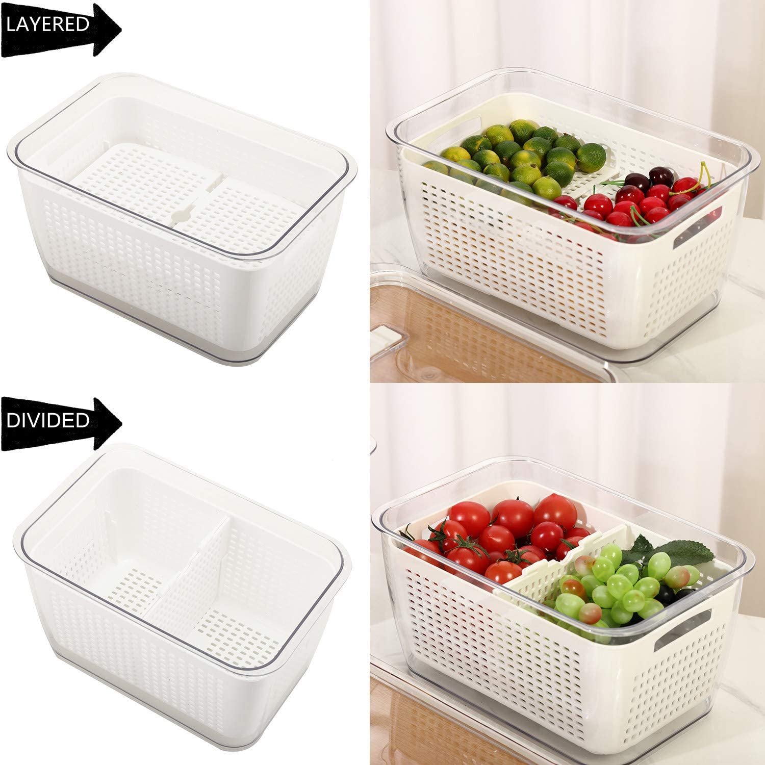 Partitioned Design - These produce storage container all come with adjustable fold-able partitions for classified storage; Can store most types of fruits and vegetables such as lettuce, cabbage, strawberry, blueberry and etc, space saving, clean and not odor.
