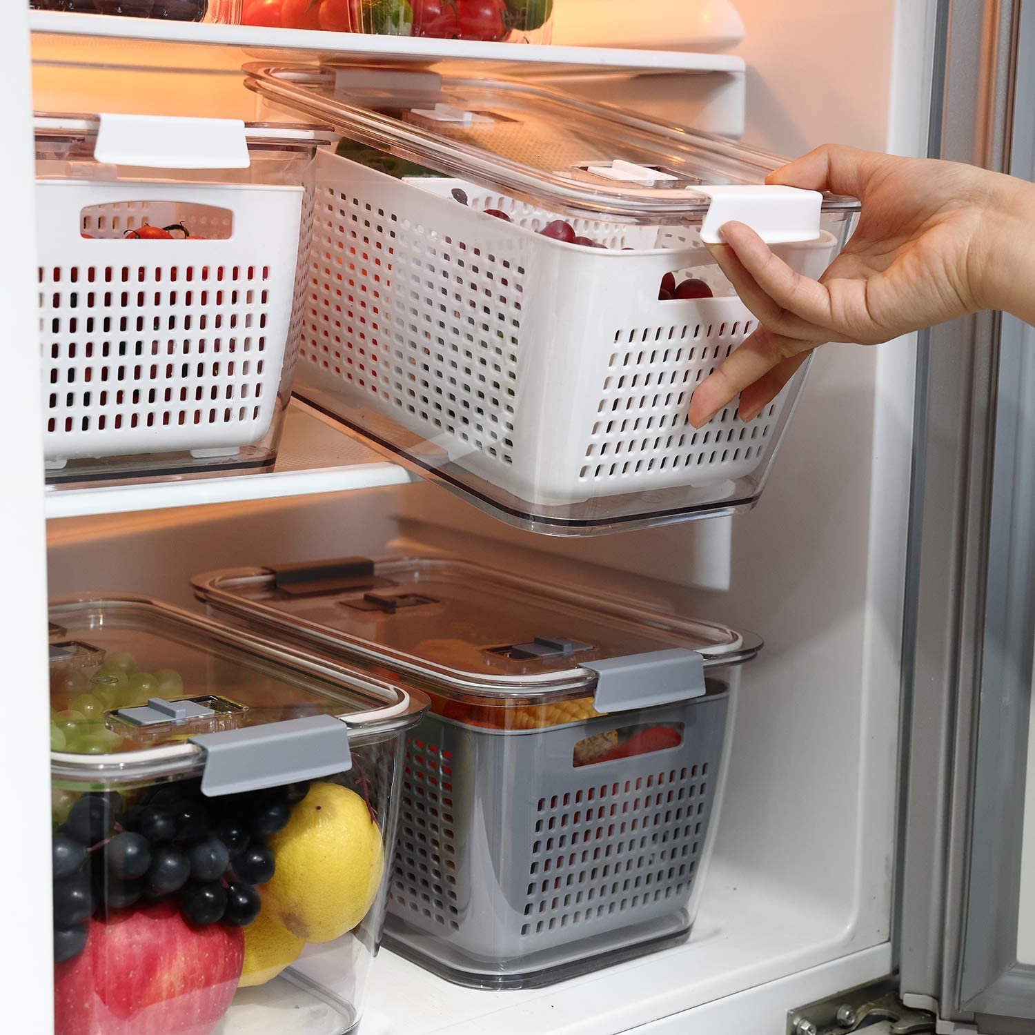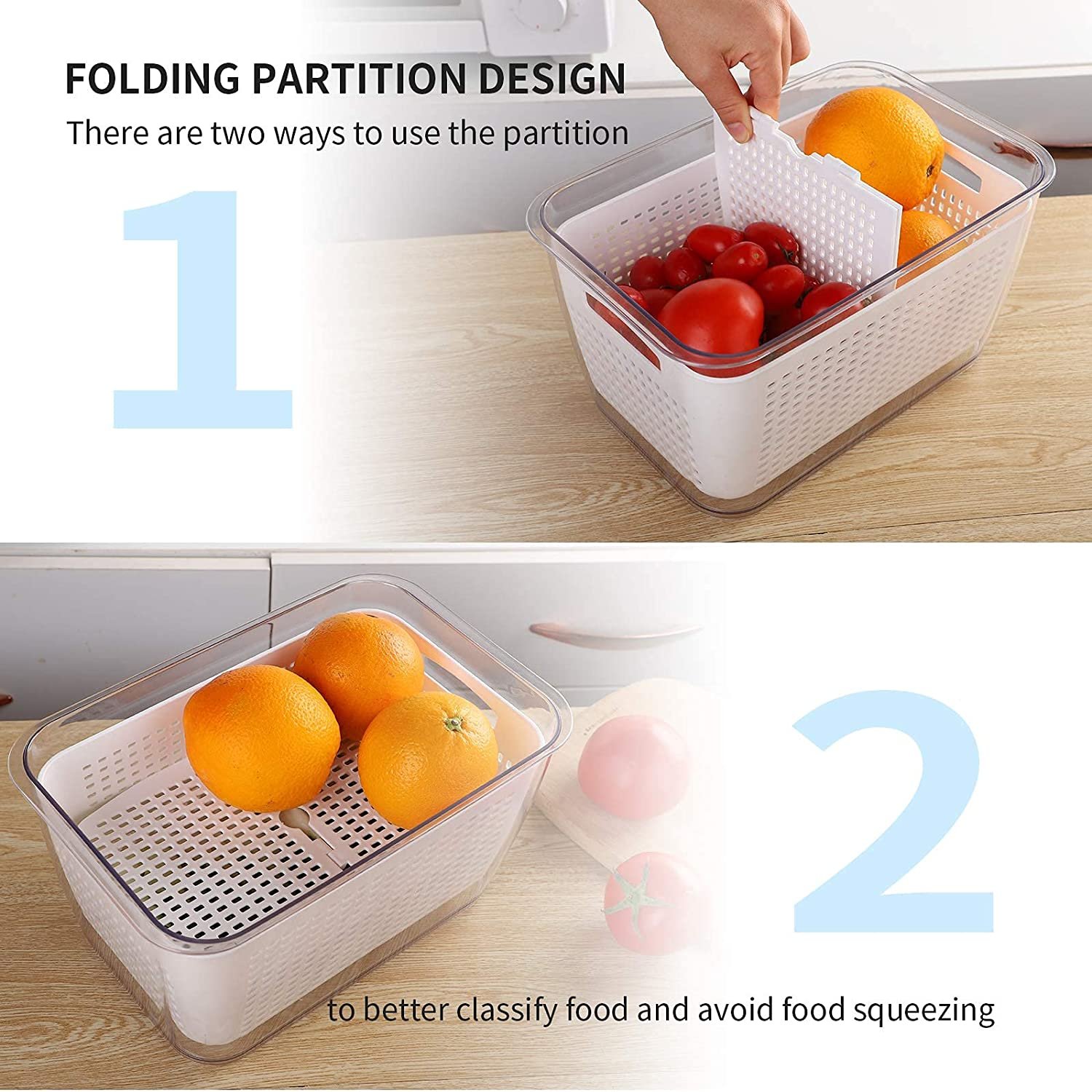 Partitioned Design - These produce storage container all come with adjustable fold-able partitions for classified storage; Can store most types of fruits and vegetables such as lettuce, cabbage, strawberry, blueberry and etc, space saving, clean and not odor.